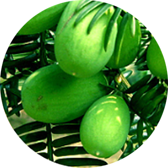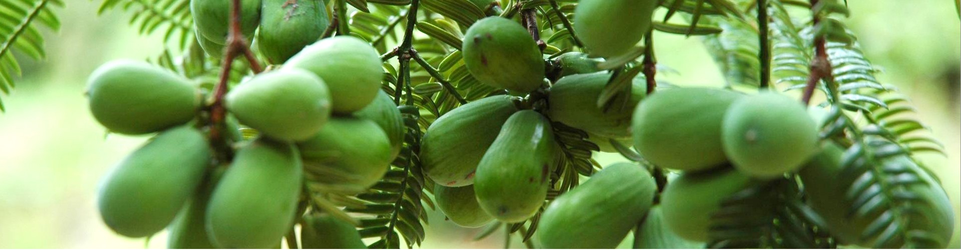 香榧高可達(dá)25米,是榧樹中的一種,通常經(jīng)過嫁接而來。香榧生長成熟期為三年:第一年開花,第二年結(jié)果,第三年成熟(不過一般要上百年才開花)?;ㄆ?月中下旬,果熟翌年9月,其果實一簇一簇地長在枝條上,一顆樹上,往往一年果、兩年果同時存在。